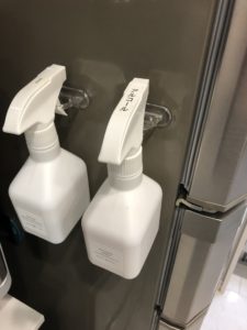 冷蔵庫の横面に掃除がしやすいように真っ白なスプレーボトル様と