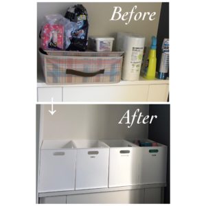 トイレの背面の台の上の収納BEFORE&AFTERです。